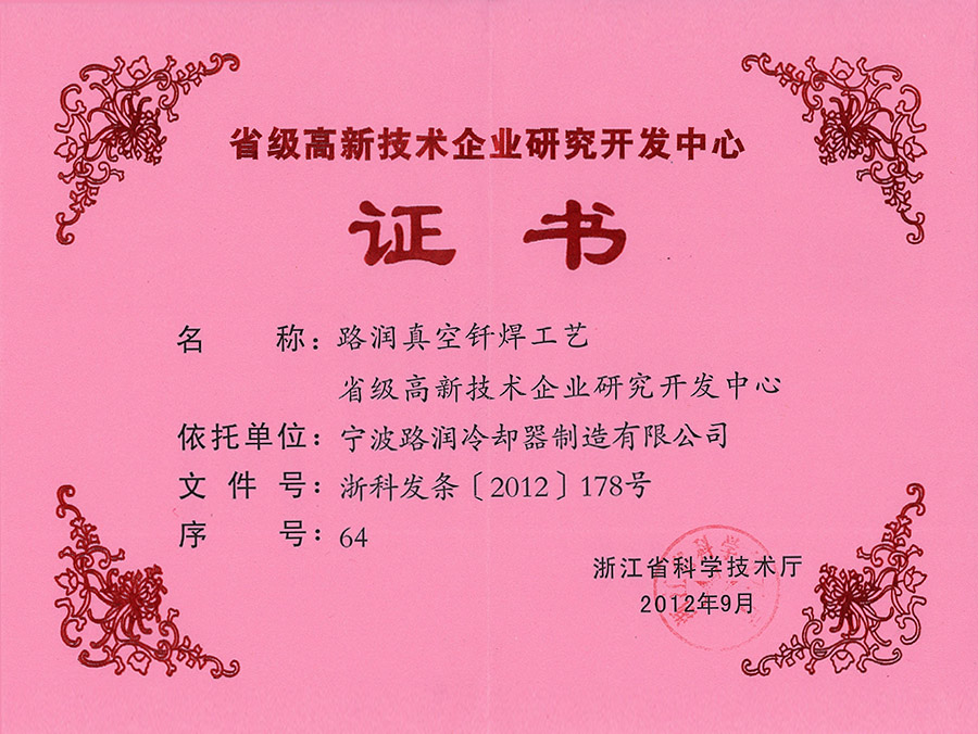 省級高新技術(shù)企業(yè)研究開發(fā)中心證書